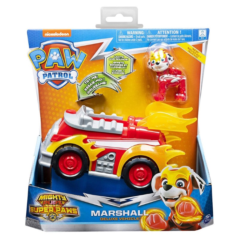Kола с колекционерска фигурка – любимия Marshall от Paw Patrol. Присъединете се към Маршал в неговите вълнуващи приключения с огнената му кола! Тя има страхотни детайли, а с натискането на един бутон започва да свети и да издава звуци! Маршал е с униформа на супер герой в жълто и червено, която е в тон с неговия супер-автомобил. Необходими са 3 броя батерии LR44 (включени в комплекта).