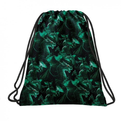 Практична спортна торба за обувки, дрехи и аксесоари с интересен мотив на мистични дракони в изумрудено зелен нюанс. Торбата разполага с дълги и здрави връзки, позволяващи чантата да се носи в ръце, на рамо или на гърба, предлага в универсален размер. Изработена е от водоустойчива материя, която лесно се почиства и е идеална както за по-малки, така и за по-големи деца.