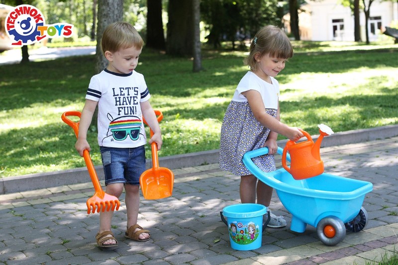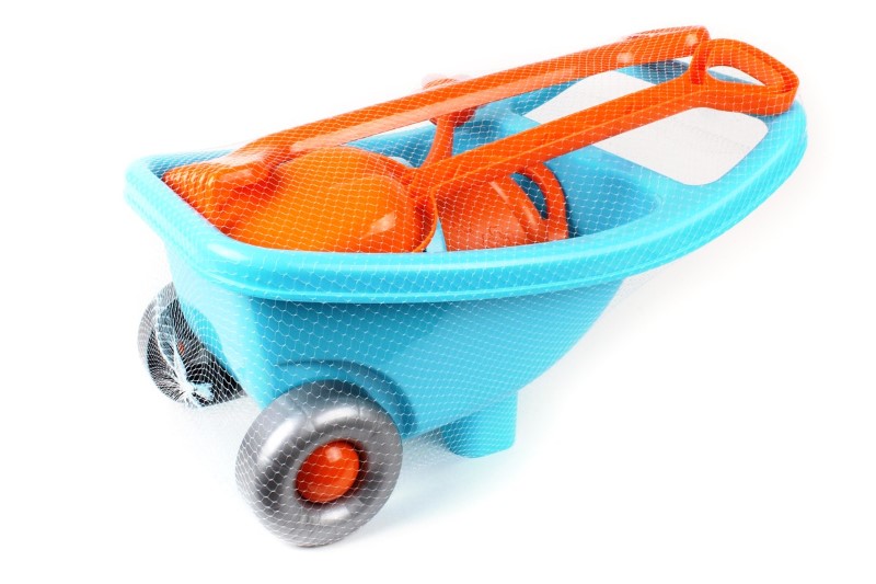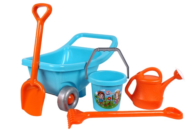 Комплектът включва: количка, лейка, кофа, гребло и лопата. Опаковката е мрежа.