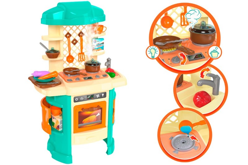 Новият интерактивен кухненски комплект е поразителен в своята реалистичност. Тази кухня ще очарова детето ви от разнообразни ефекти: яркочервено осветление на горелката, звукови ефекти („съскане“ и „буботене“). От тенджерата, в която се „готви“ нещо, се издига бяла пара. Но родителите не трябва да се притесняват – парата е само успешна имитация, всъщност е студена и безопасна за детето. Това се наблюдава най-добре в тъмна тенджера с прозрачен капак.