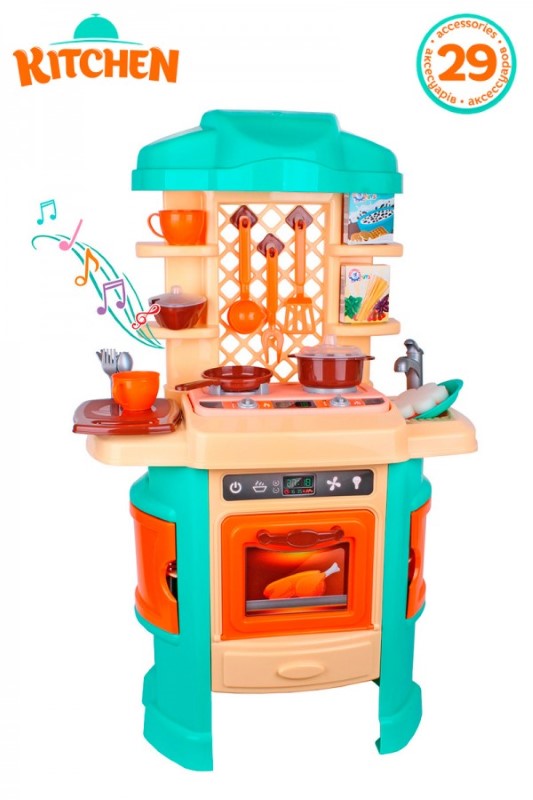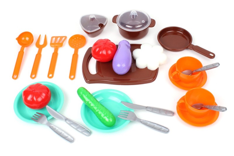 Кухненският комплект съдържа всички необходими прибори за приготвяне на вкусни ястия. Има тенджера с прозрачен капак (с отвори за пара), тиган, дъска за рязане и ярки зеленчуци. Две картонени кутии със „спагети“ и „зърнени храни“ за приготвяне на здравословна закуска, а за пиене на чай – две чаши с чинийки и захарница. И след вкусна вечеря – трябва да измиете чиниите. За това има мивка с кран и гъба във формата на цвете.