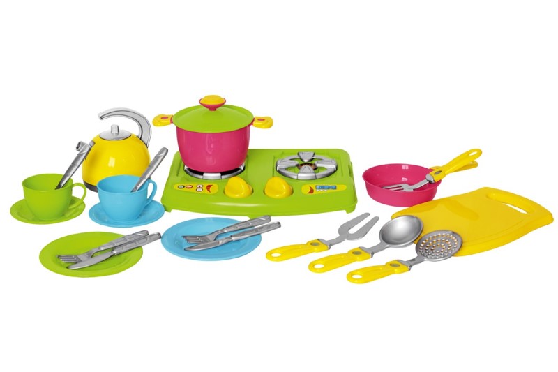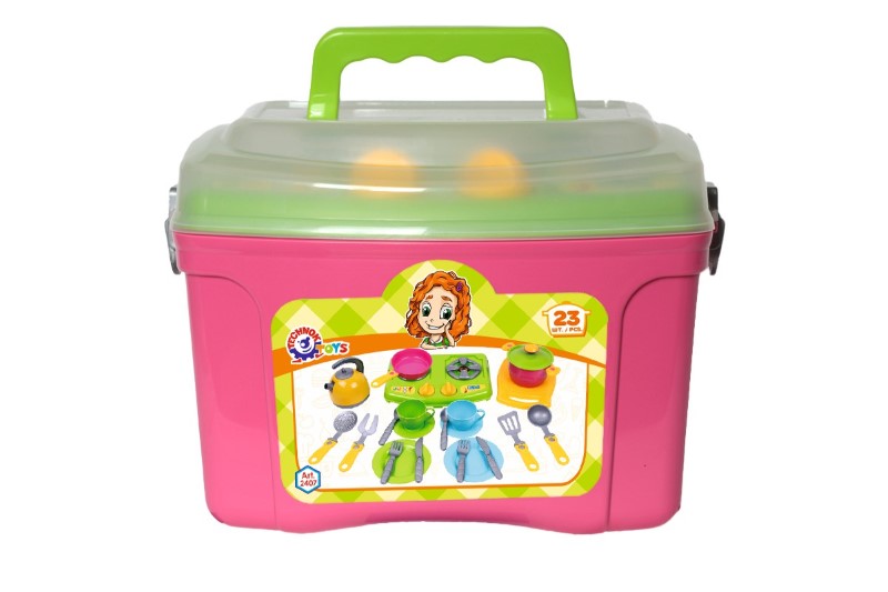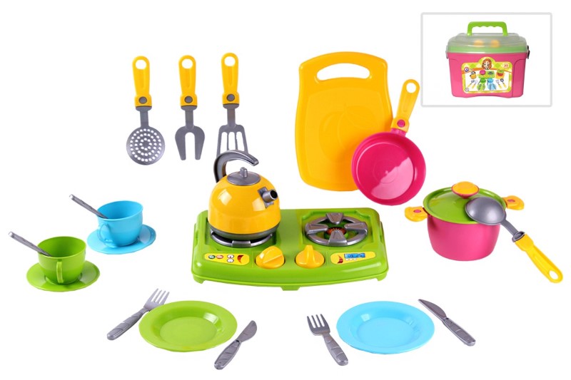 Детска кухня в куфарче включваща миниатюрна печка с два котлона за готвене и различни съдове за готвене и сервиране: тенджера, тиган, чайник, чашки и чинийки и прибори за хранене. Благодарение на този компактен комплект, детето ще се научи да приготвя вкусна и апетитна храна, имитирайки своята майка в кухнята. Елементите са изработени от екологично чисти пластмасови материали.