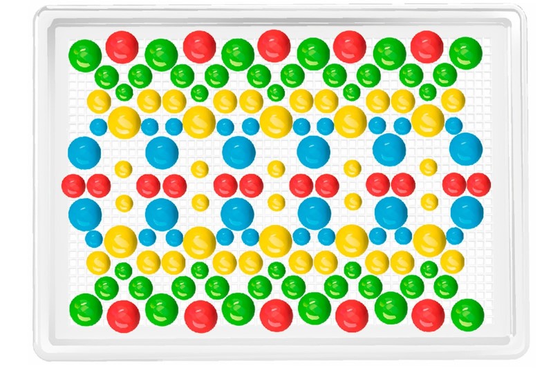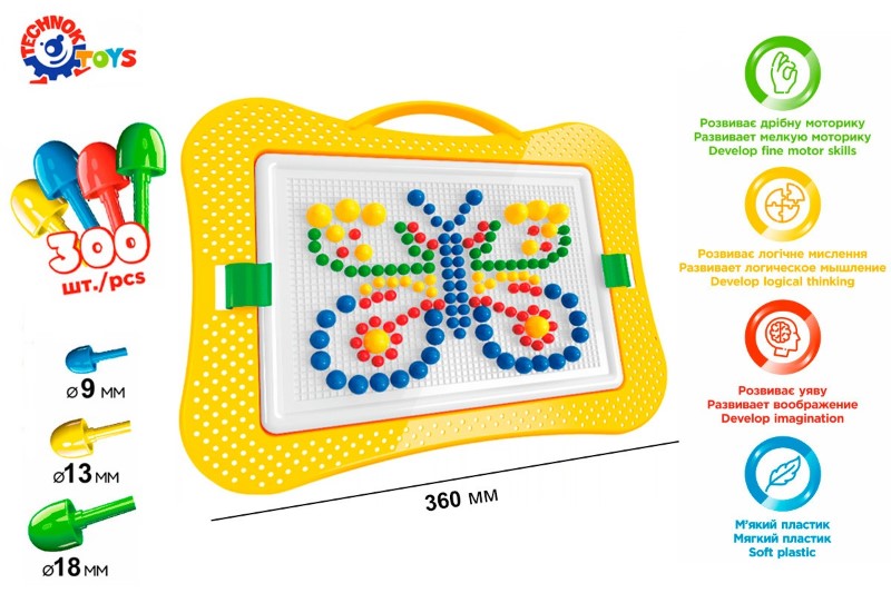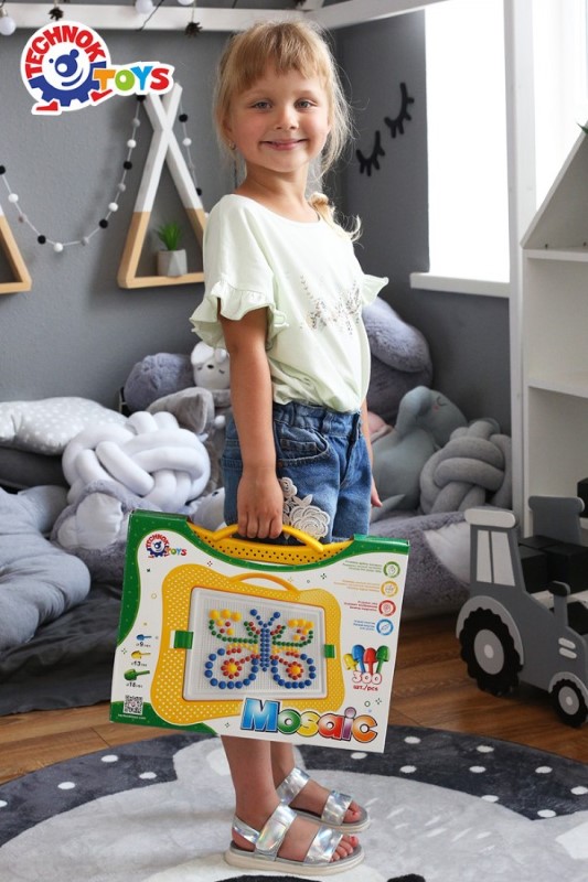 Забавна детска мозайка съдържаща 300 чипа (размер на елемента 9, 13 и 18 мм) в четири цвята, с които могат да се наредят безброй различни картини. Препоръчително е да се започне с картините включени в комплекта. Мозайката е с удобна дръжка, като долната и част може да се използва и като кутия за моливи, която здраво се затваря с две щипки. Комплектът е удобен и за път.