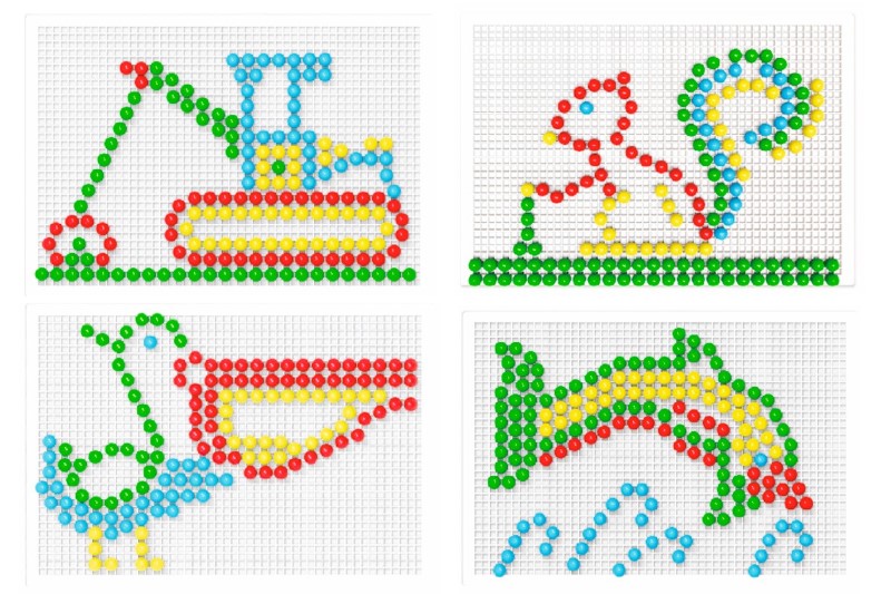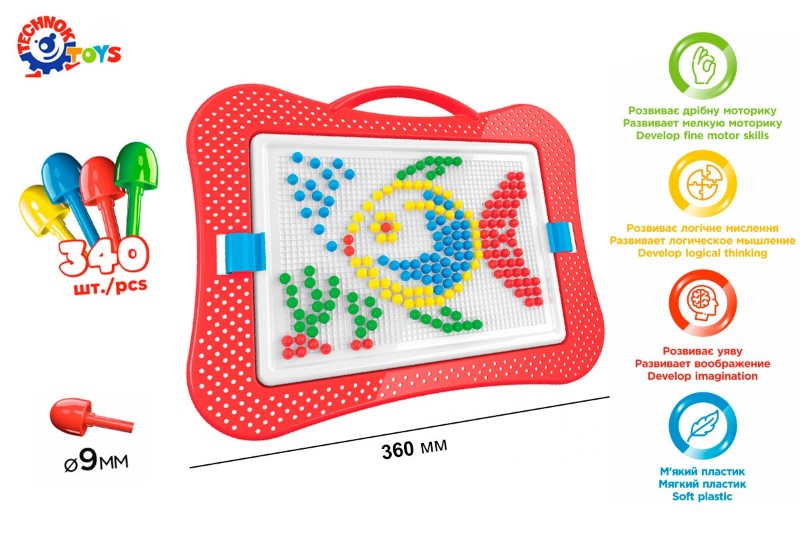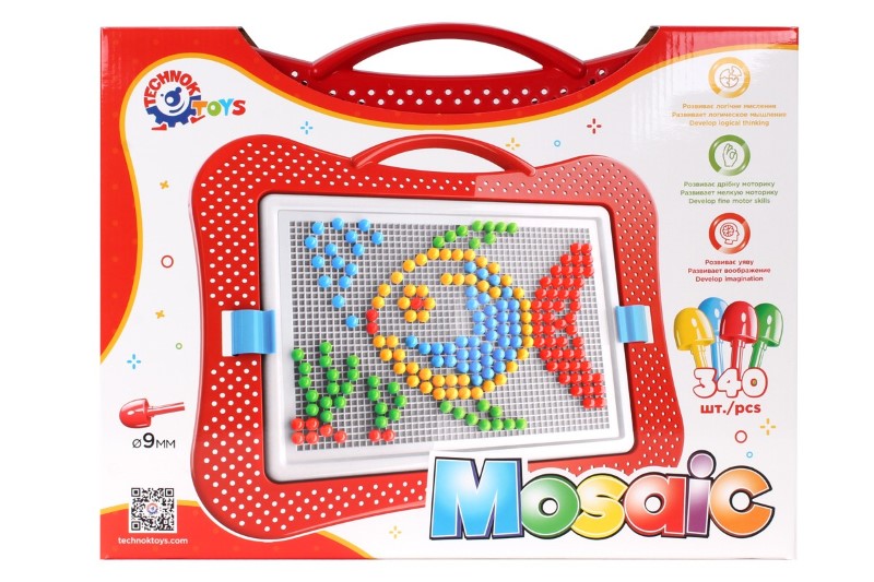 Забавна детска мозайка съдържаща 340 чипа (размер на елемента 9 мм) в четири цвята, с които могат да се наредят безброй различни картини. Препоръчително е да се започне с картините включени в комплекта. Мозайката е с удобна дръжка, като долната и част може да се използва и като кутия за моливи, която здраво се затваря с две щипки. Комплектът е удобен и за път.
