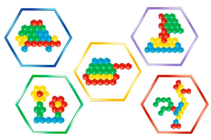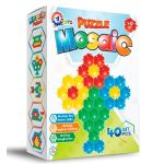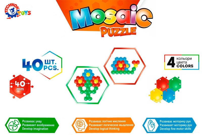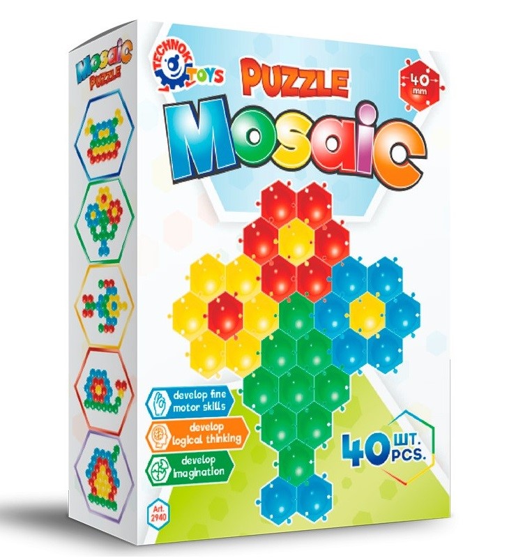 Детска мозайка/пъзел съдържаща 40 едри шестоъгълници с размер 4 см в различни цветове, с които могат да се наредят безброй различни модели и картини. Развива двигателните умения, концентрацията и сръчността на децата. Може да се реди и на земята. Препоръчително е да се започне с картините включени в комплекта. Мозайката е подходяща за по-малки деца. Комплектът е удобен и за път.