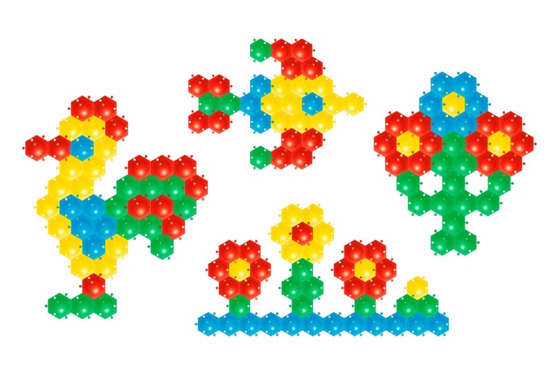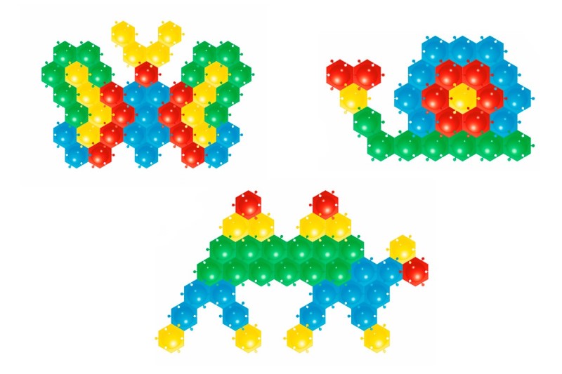 Тази мозайка-пъзел се състои от 52 цветни шестоъгълници (размер на елементите 6 см), от които детето може да направи всякакви форми и модели подреждайки ги на земята. Играта развива детския художествен вкус, сръчността, координацията и подвижността на ръцете.