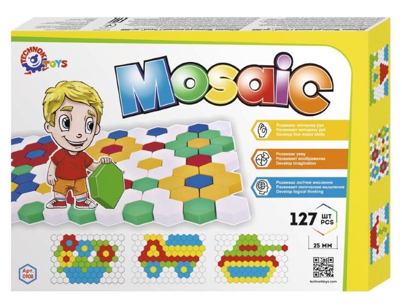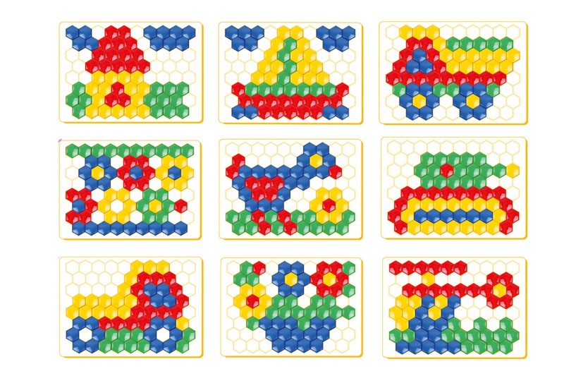 Забавна детска мозайка съдържаща 127 едри части в различни цветове, с които могат да се наредят безброй различни картини. Препоръчително е да се започне с картините включени в комплекта. Мозайката е подходяща за по-малки деца. Комплектът е удобен и за път.