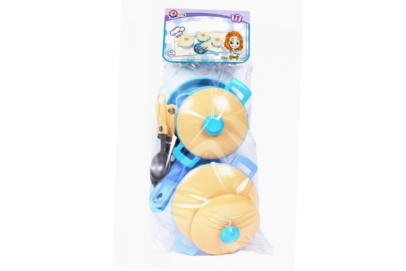 Детски пластмасов сервиз за готвене включващ 11 части: 2 тигана, две тенджери, 3 капака, черпак, вилица, шпатула и решетъчна лъжица. Прекрасен е за игра от бъдещите малки домакини, които ще приготвят вкусни ястия за своите кукли. Комплектът е изработен от качествени материали и е подходящ и за детски градини.