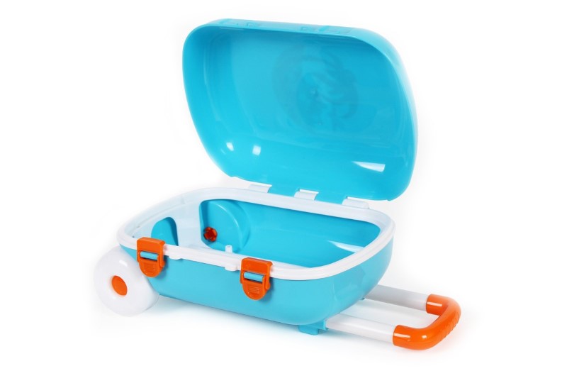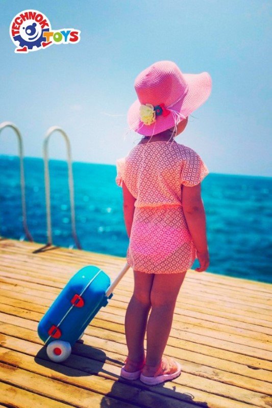 Куфарът за играчки на Technok Toys е интересен, функционален и наподобява истински куфар за възрастни. Изработен е от устойчива и висококачествена пластмаса, оцветен в ярко син цвят с оригинални стикери. Куфарът е на колелца, с удобна регулируема дръжка и надеждни щипки позволяващи лесно да затворите капака и да съхранявате играчките или дрешките си в него. С този куфар децата ще могат да съхраняват любимите си играчки и принадлежности по време на пътешествие, плаж или разходка.