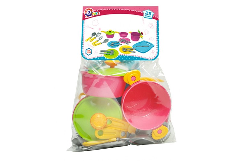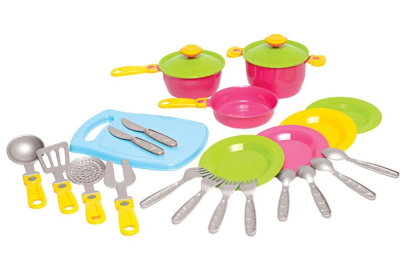 Детски кухненски комплект чудесен за игра от бъдещите домакини. Комплект включващ: тенджера, 2 тигана, 4 вилици, 4 лъжици, 2 ножа, 4 чинийки, дъска за рязане и кухненски прибори за готвене. Комплектът е изработен от качествени материали и е подходящ и за детски градини. Комплектът е идеално допълнение към всяка детска кухня.