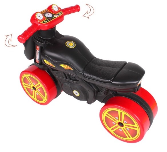 Благодарение на специалния волан, който може да се върти на 360 градуса, моторът е много маневрен, а широките и надеждни колела правят движенето стабилно. Играчката подобрява координацията на движенията.