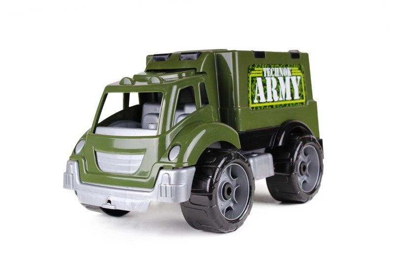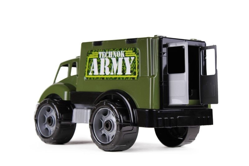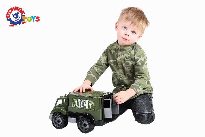 Детски военен камион, с който децата ще играят както у дома, така и на детската площадка. Благодарение на големите си колела и здравата рамка, машината демонстрира висока способност за движение по пътищата и извън тях. Задните врати на автомобила се отварят, така че разнообразни стоки могат да бъдат натоварени в каросерията и да бъдат транспортирани.