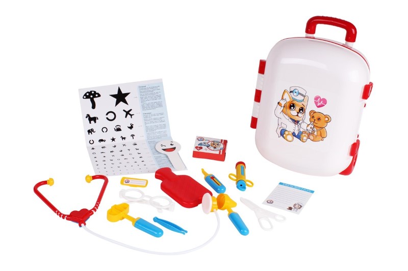 Комплектът съдържа: стетоскоп, чук, термометър, спринцовка, ножица, нагревателна подложка, пинсети, лист с рецепта, кутия за играчки с хапчета, очила „доктор“ и дори специална маса за тест на зрението.