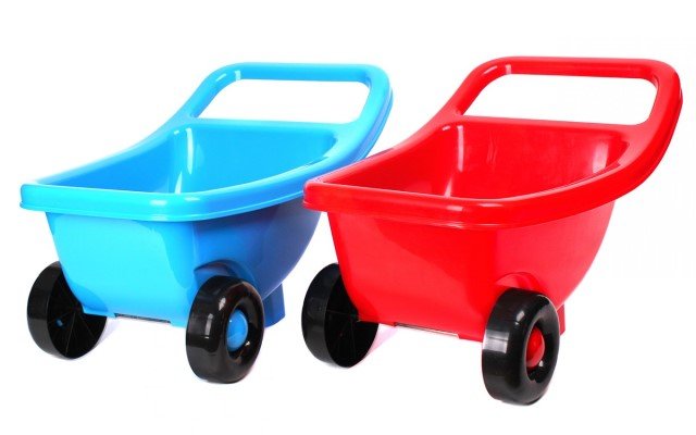 Детска пластмасова ръчна количка, с която децата могат да си транспортират своите играчки и други неща, където си пожелаят. Благодарение на двете си колела и двата крака, количката е изключително стабилна и удобна за бутане от малчуганите. Налични са два цвята. При поръчка, моля отбележете кой цвят сте си избрали. Цената е за 1 брой.