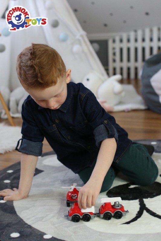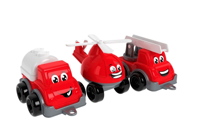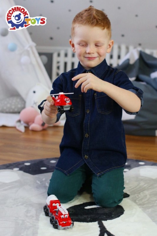 Комплектът „Мини Транспорт ТехноК” е комплект от 3 пожарникарски транспортни средства – кола, хеликоптер и цистерна. Такъв екип винаги ще бърза да помогне на героите на играчките!