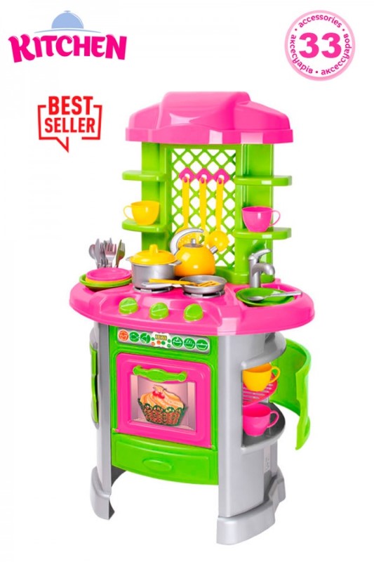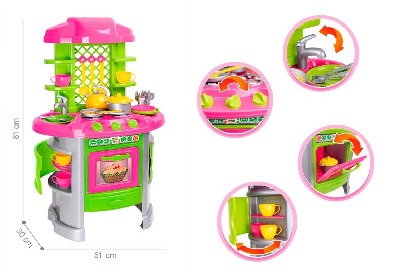 Детска кухня с красив дизайн, разполагаща с кухненски шкаф, фурна, мивка, абсорбатор и съдове. Малките готвачи с удоволствие ще сготвят супа в тенджерката или ще изпържат вкусни палачинки в тигана. Можете и да направите пиша или да изпечете месо във фурната. Когато свършите с готвенето, можете да измиете съдовете в мивката и да подредите всичко по рафтовете. По време на игра, децата ще научат кухненските артикули и какво се прави с тях.