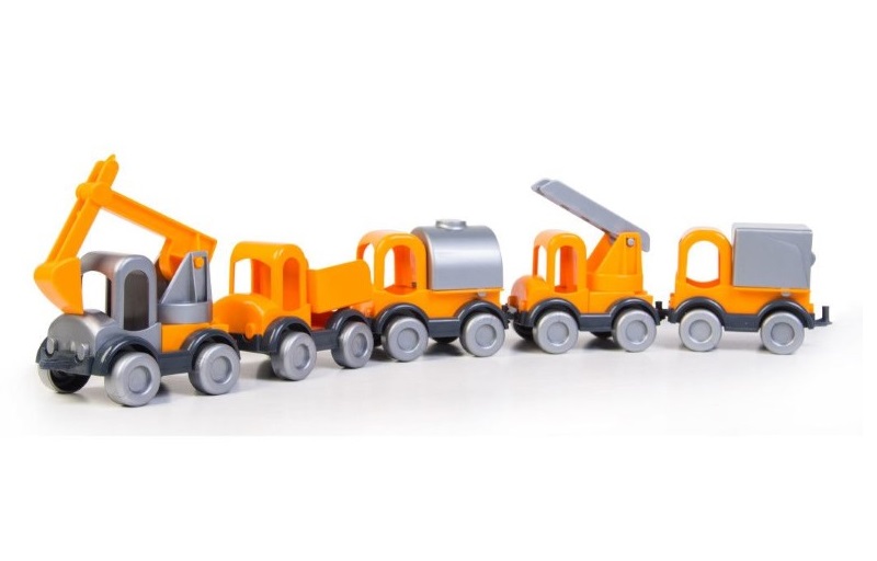 Комплект от 5 ярки строителни колички, с които играта на децата ще бъде невероятно забавна и ще им даде много положителни емоции. Малкият размер на колата ще бъде удобен и за най-малките ръчички, а липсата на малки части прави играчката безопасна за деца.