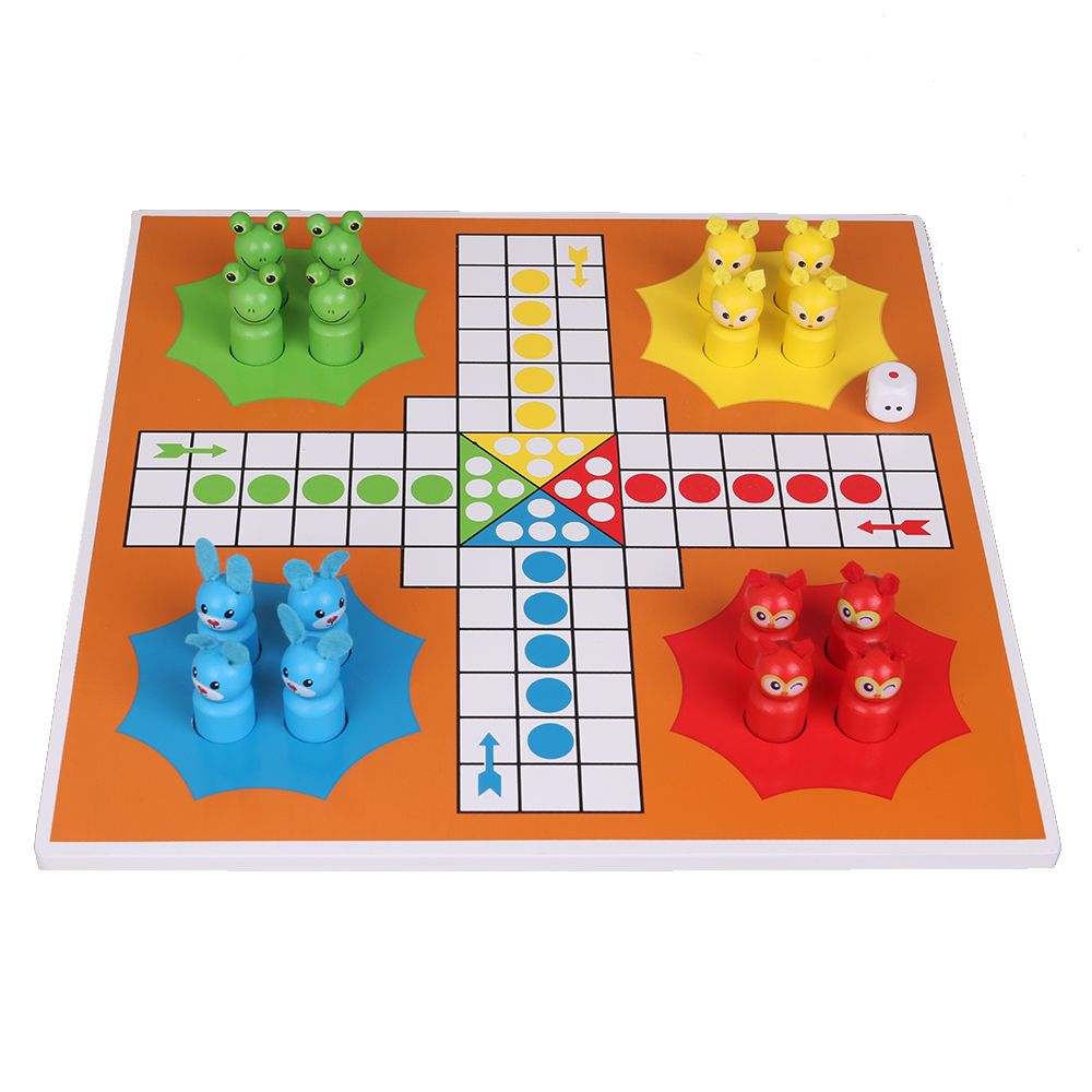 Забавна игра на „Не се сърди човече“ с пионки на животни – жабка, зайче, бухал и мишле, подходяща за цялото семейство.