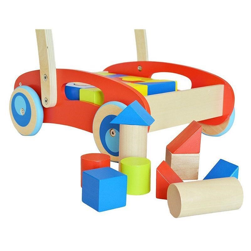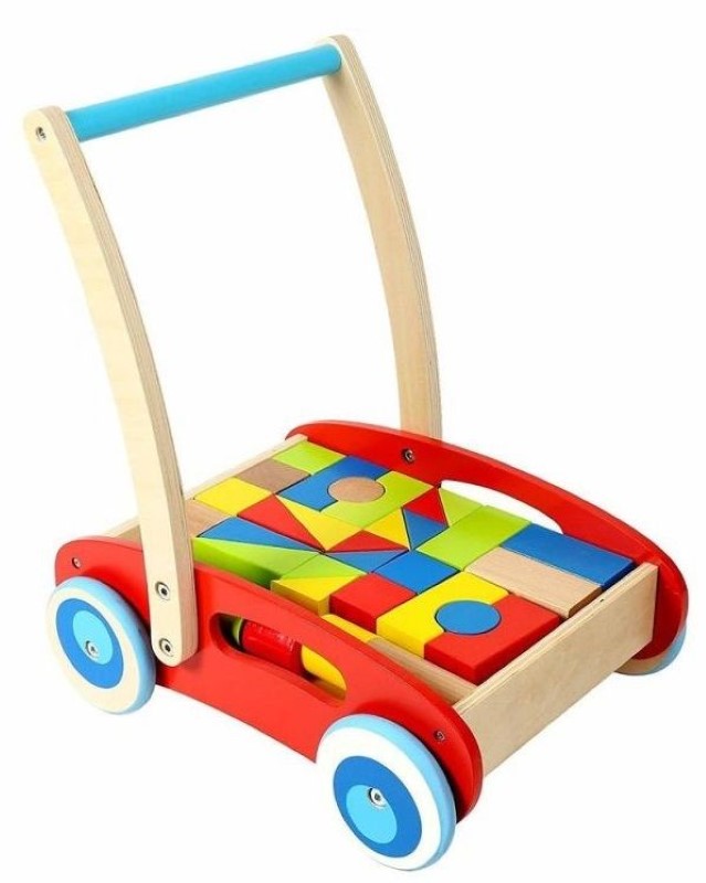 Детска количка изработена от здрава и качествена дървесина, която ще помогне на детето ви да направи първите си стъпки, опитвайки се да я бута напред/назад. Проектирана е така, че детето да може да се движи стабилно и свободно, като се държи за дръжката. А когато се умори да ходи, то може да се забавлява, като подрежда, реди и сортира цветните дървени блокчета (32 броя). Количката е с гумирани колела и не оставя следи по пода. С нея вашето дете ще може да превозва и любимите си играчки, както и да се разхожда навън.