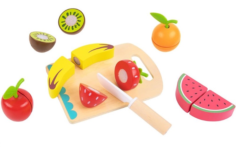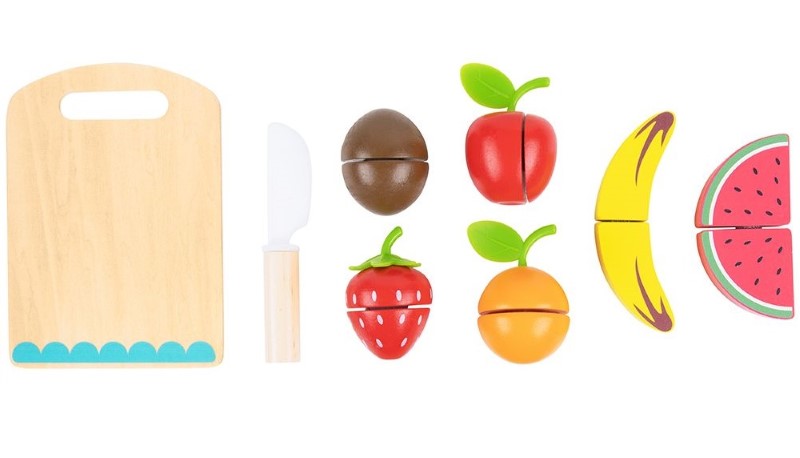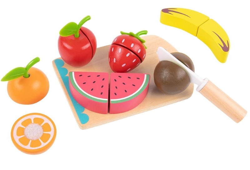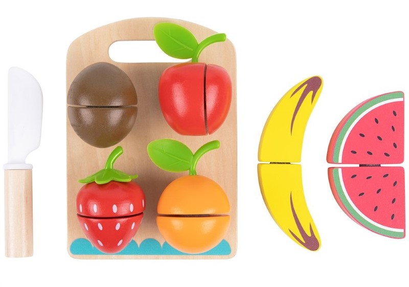Този комплект от дървени храни за игра включва селекция от различни плодове, които могат да бъдат нарязани с помощта на ножче. Осигурявайки пълна безопасност, вашето дете може да нареже плодовете на дървената дъска за рязане. Комплектът включва диня, киви, лимон, ягода, банан и ябълка, като всички плодове са направени от две части свързани помежду си с лепенки от велкро, което позволява многократното им нарязване. Комплектът е чудесно допълнение към всяка детска кухня или магазин. Изработен е от висококачествени материали, съответстващи на действащите европейски стандарти за безопасност.