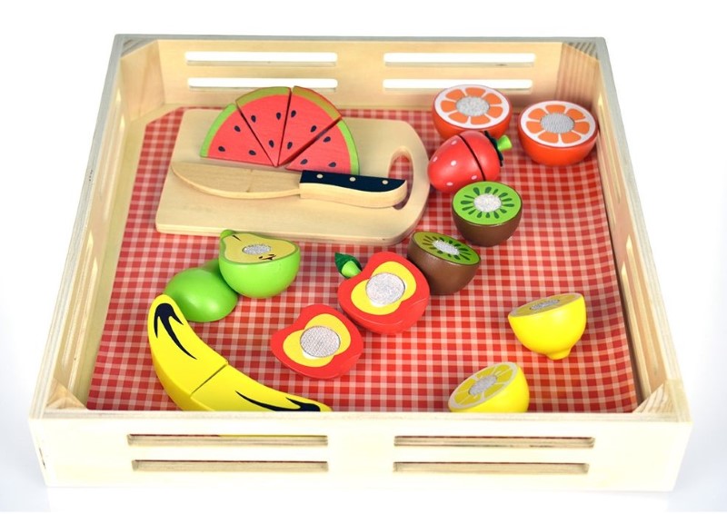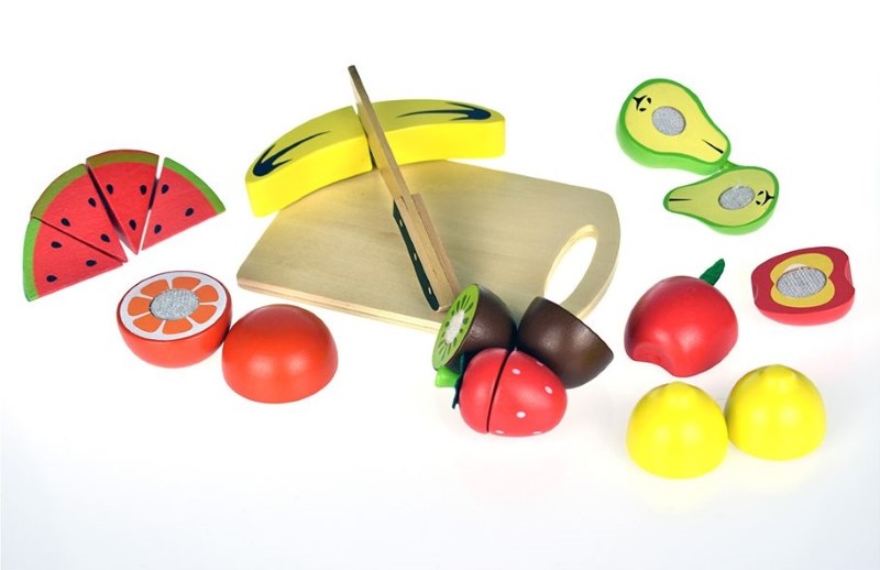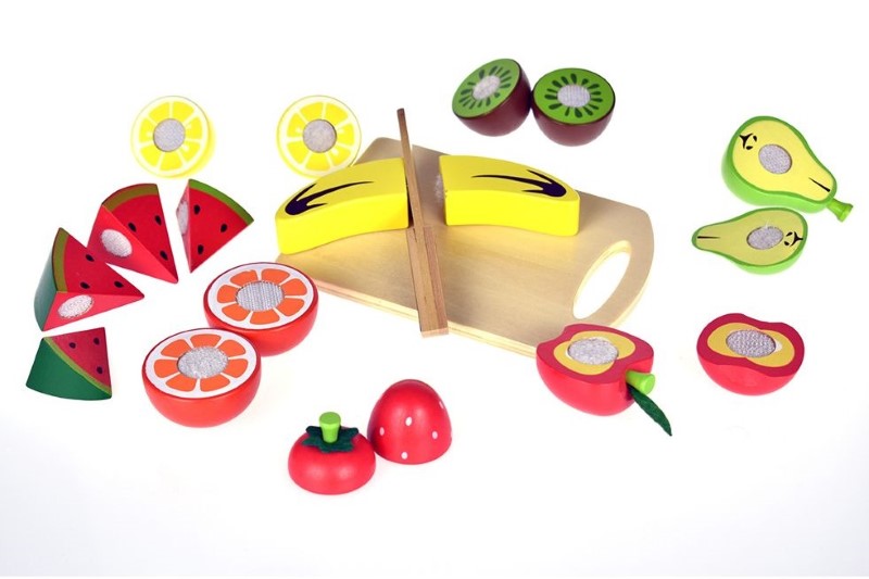 Комплектът включва 8 различни вида плод: диня, киви, лимон, ягода, банан и ябълка, круша, портокал, като всички плодове са направени от две части свързани помежду си с лепенки от велкро, което позволява многократното им нарязване.