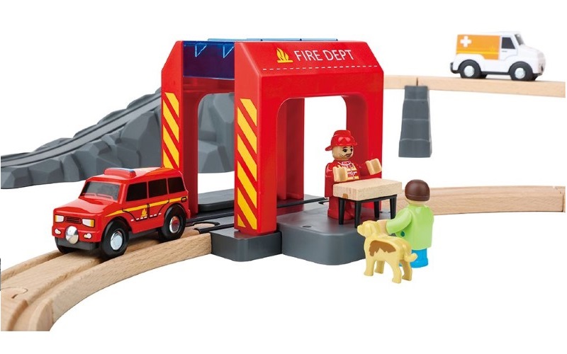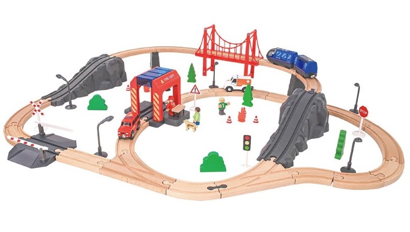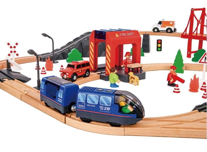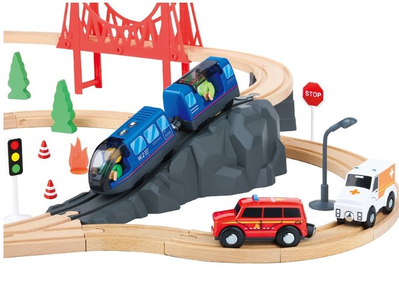Детски игрален комплект с ЖП линии, мостове и прелези, през които преминават влакчета с вагони и коли за спешна помощ.