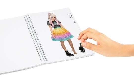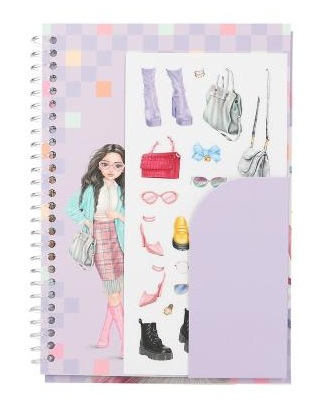 Джобна книжка за оцветяване от TOP Model с лъскава корица и включени 120 страници с фигурки на модели, които могат да бъдат оцветени и украсени с включения 1 лист със стикери с модерни аксесоари.