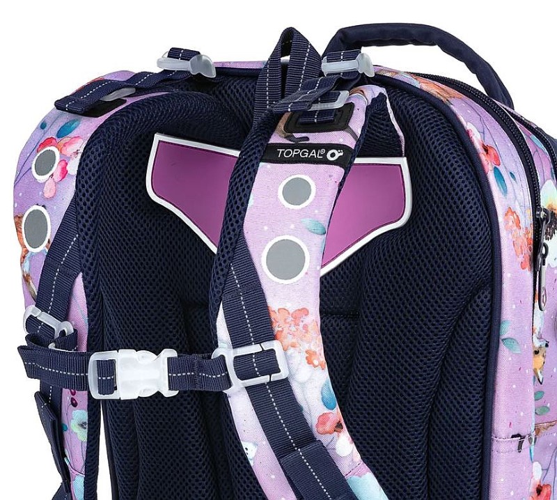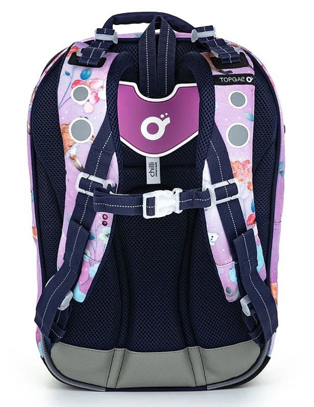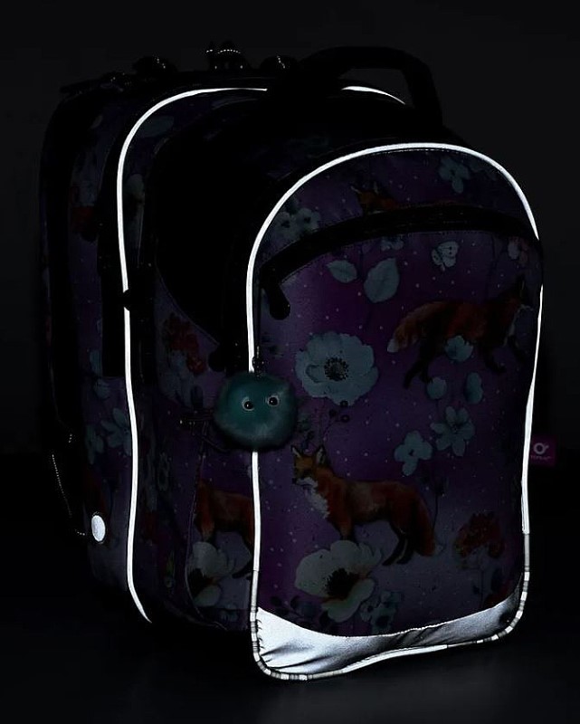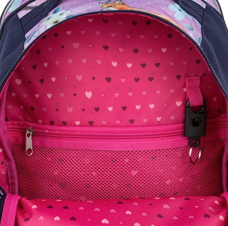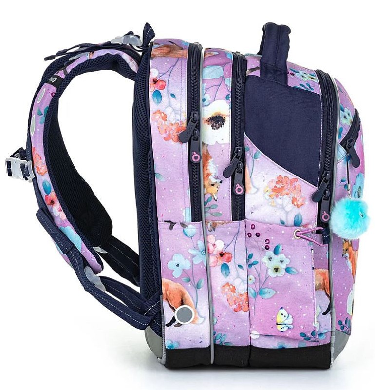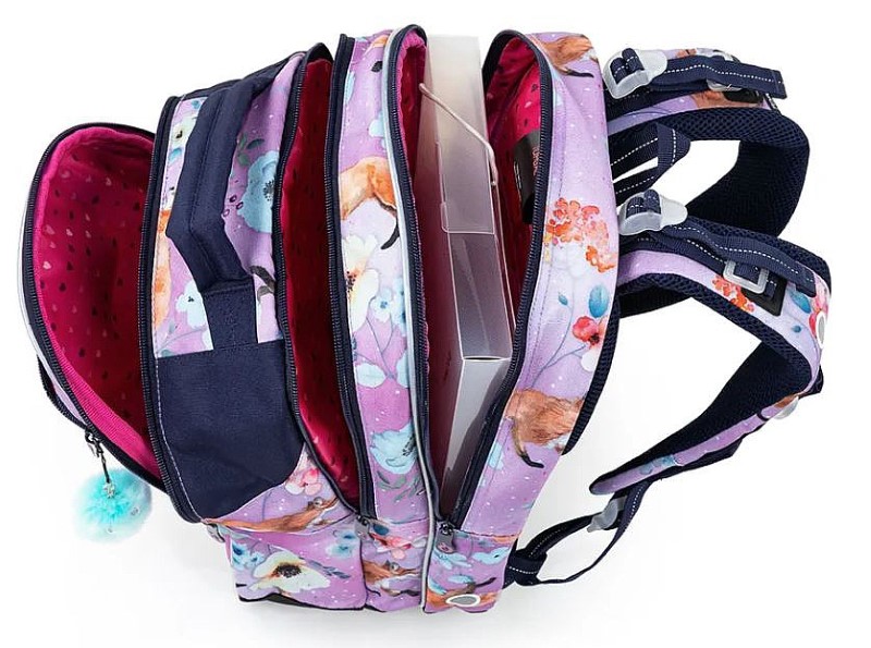Раницата COCO има три отделения – тя е с универсална кройка, която ще бъде полезна на децата от 1 – 4 клас на основното училище. Ще се поберат всички учебници както на първокласници, така и на четвъртокласници (а понякога и до 5-ти клас, в зависимост от училището). Момичетата ще се насладят на красивата шарка на раницата – лисици и цветя на акварелен лилав фон и пухкава висулка.