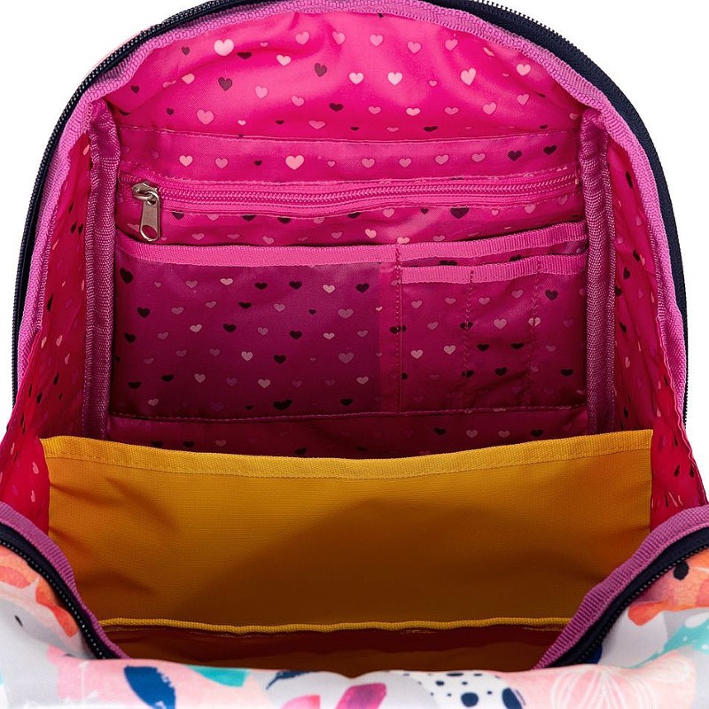 Вътрешността на ученическата чанта BEBE е разделена на три части чрез прегради. Отделенията са водоустойчиви, така че мокра ябълка няма да изцапа преносимите вещи. Вътре има и органайзер. Предлагаме ви да носите бутилката за напитка в страничния джоб от външната страна на ученическата чанта, който е скрит зад ципа.