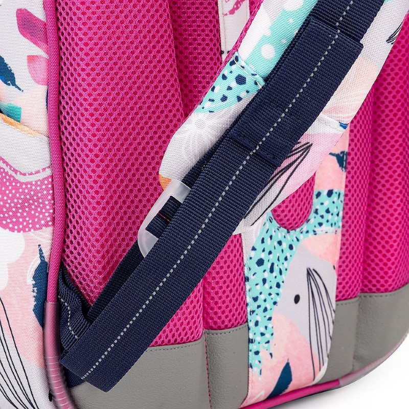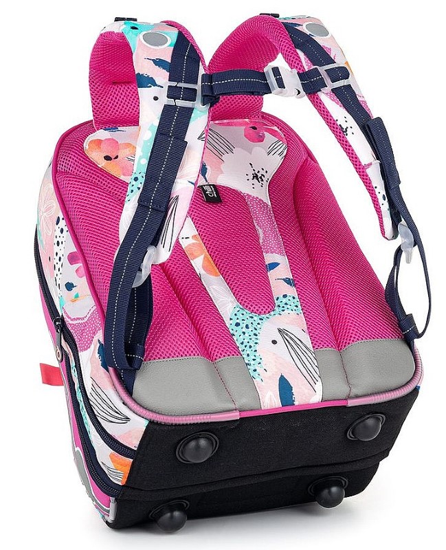 Гърбът на ученическата чанта BEBE е меко подплатен, с анатомична форма. Вътре, в специален джоб отзад, има лека алуминиева рамка, която може да се сваля. Презрамките са плътно подплатени и анатомично оформени. Ученическата чанта може да се адаптира към индивидуалната височина на детето благодарение на двойното регулиране на колана. Горната настройка служи за определяне на разстоянието на раницата от гърба, а долната – височината на гърба. Първо регулирайте долната част, след това горната част. Накрая затегнете колана с гръдния колан и регулирайте опъването му – не трябва да е стегнато напълно, защото би ограничило движението.