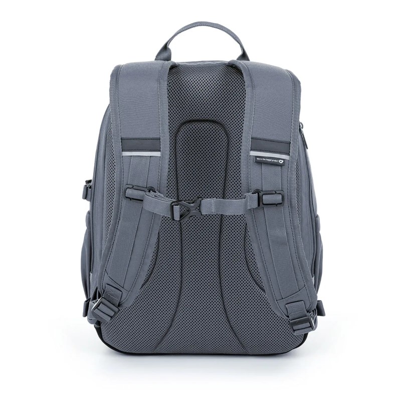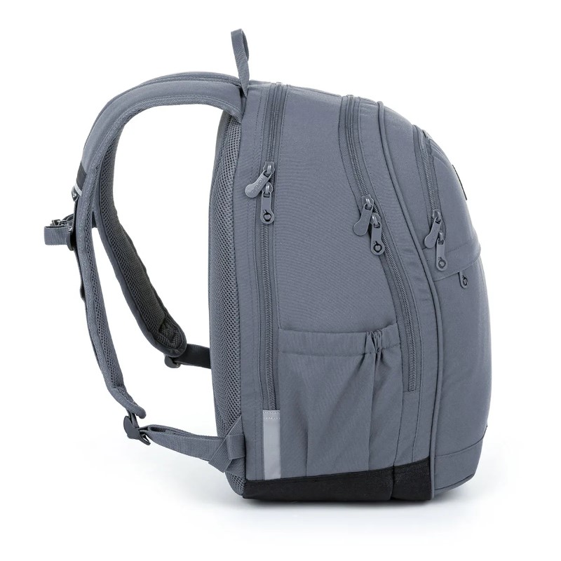 Раница с две отделения в сив цвят, подходяща за ученици с ръст над 145 см. Гърбът на раницата е подплатен, анатомично оформен и здрав благодарение на леката алуминиева армировка. В задното отделение ще намерите подплатен джоб за лаптоп и таблет и още един по-малък за мобилен телефон. Второто отделение включва мрежест джоб за документи и карабинер за ключове. В десния страничен джоб може да се постави 1,5-литрова бутилка за пиене, левият страничен джоб се закопчава с цип.