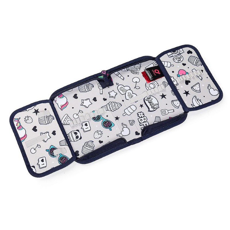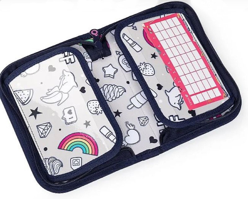 Еднокамерен несесер за ученически пособия, разполагащ с 21 гъвкави класически държача за моливи, химикалки, три широки държача за линийка и два големи държача за острилка, гумичка. От едната страна несесерът има прозрачно отделение с разписанието. Закопчава се с цип с големи дръжки за лесно отваряне.
