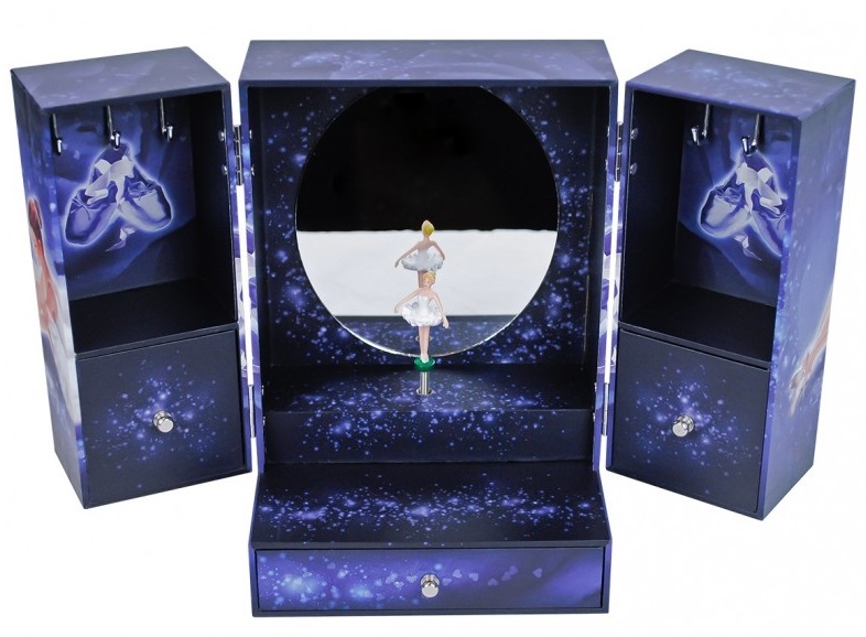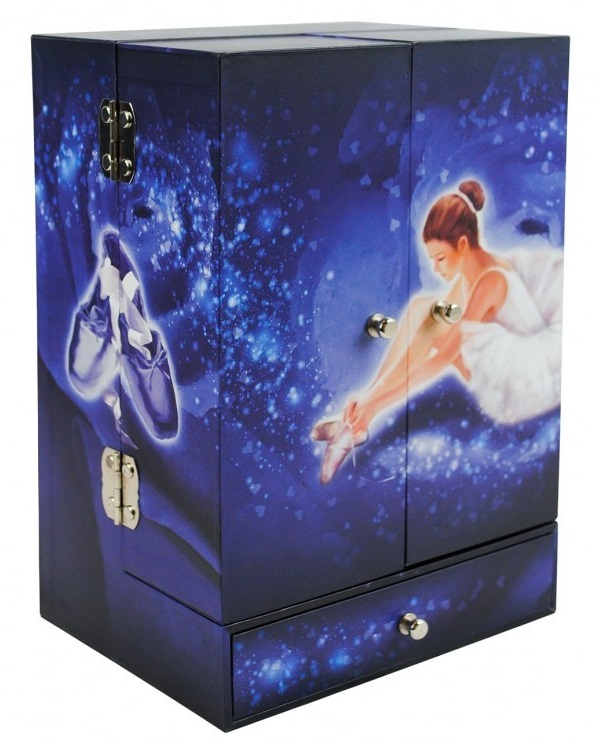 Музикална кутия за съхранение на бижута и аксесоари във формата на гардероб, която ще очарова всяко момиче. В нея има различни отделения за пръстени, колиета и гривни.