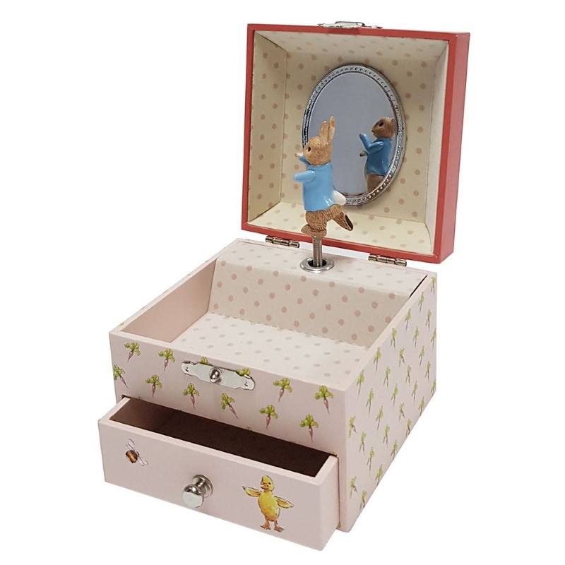 Музикална кутия с чекмедже и огледалце за съхранение на аксесоари и тайни. Когато отворите капачето, ще се покаже фигурка с Зайчето Питър, която ще се завърти в ритъма на мелодията: Minuet – W.A. Mozart.