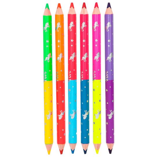 Комплект от 6 цветни молива с двойно повече забавление при оцветяване. Моливите от Ylvi имат оцветяващ връх от всяка страна, така че 6-те молива ще ви предложат 12 цвята за рисуване и оцветяване. Опаковани са в прозрачна кутия със сладък принт.