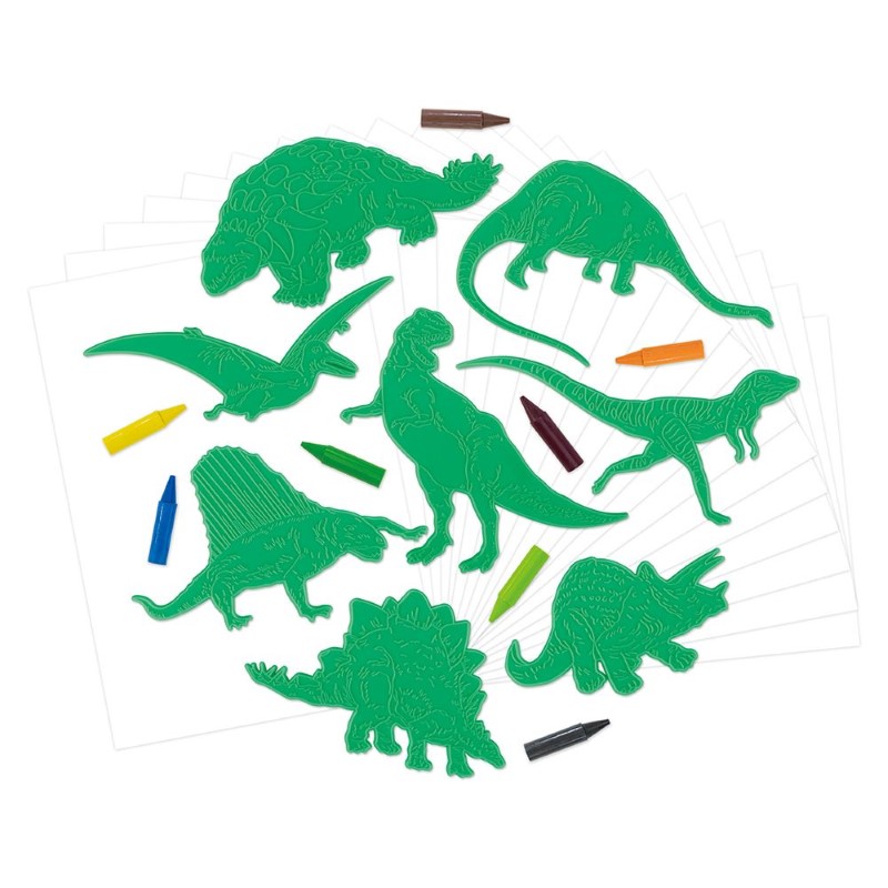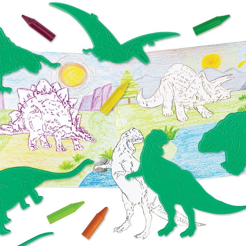 В комплекта децата ще намерят 8 реалистични шаблона с релефни детайли на праисторически животни. Като с тях децата имат възможност да копират изображенията, като ги натрият отгоре с някой от 8-те восъчни цветни пастела, включени в комплекта, или просто да ги очертаят и след това да оцветят. Постепенно децата могат да преминат към по-сложни рисунки и колажи, като за целта им е необходима гъста боя, с която да оцветят избрания шаблон и след това да пренесат изображението на друг лист хартия или текстил.