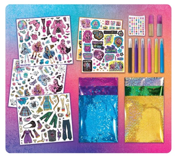 В този уникален творчески комплект, ще намерите много увлекателни дейности, които ще ви отведат във магическият свят на „Monster High“. Страниците на тази книжка съдържат изображения на любимите Ви героини от поредицата Monster High, като това не е всичко. Благодарение на включените мини маркери можете да им придадете уникален вид, като ги облечете в уникални блестящи дрехи.