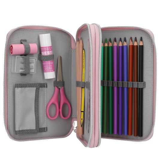 Двете отделения се затварят с цип и са със включени – 18 цветни молива, 2 HB молива, гумичка, острилка, линийка, ножица и лепило.