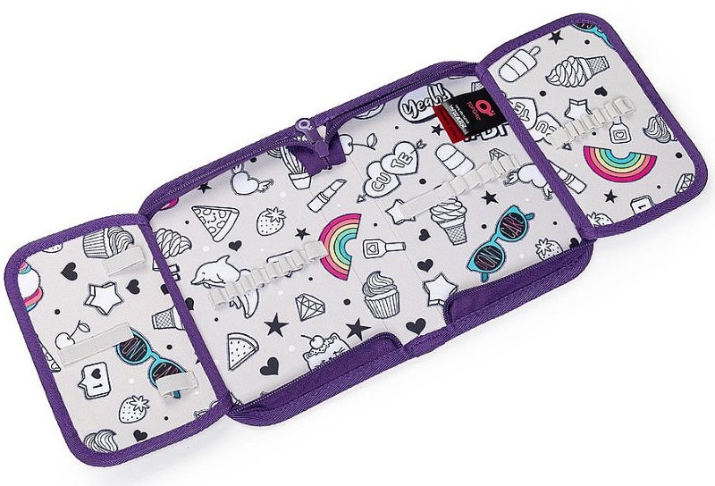 Еднокамерен несесер за ученически пособия, разполагащ с 21 гъвкави класически държача за моливи, химикалки, три широки държача за линийка и два големи държача за острилка, гумичка. От едната страна несесерът има прозрачно отделение с разписанието. Закопчава се с цип с големи дръжки за лесно отваряне.
