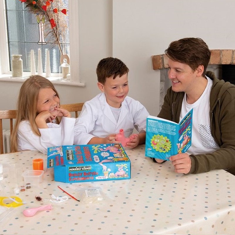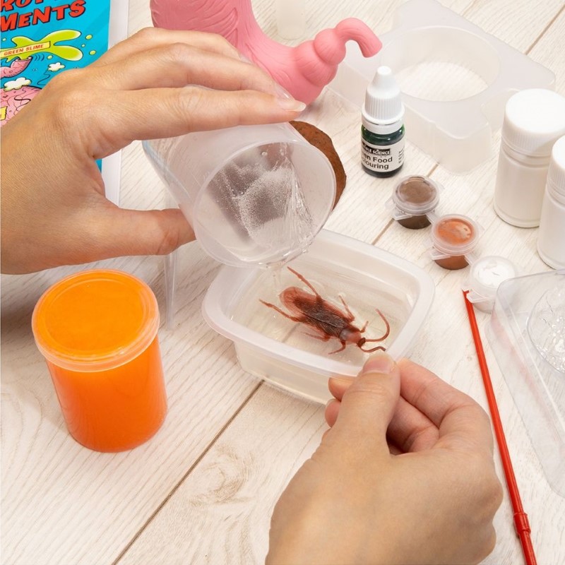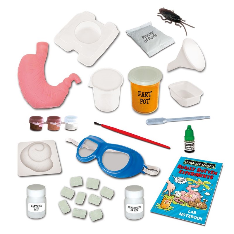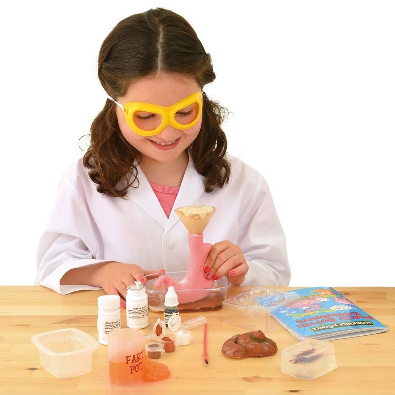 Комплектът съдържа различни аксесоари като: пластмасов стомах, оцет, фуния, сода бикарбонат, очила, калъп, бои и четка, зелен хранителен оцветител, парчета глицеринов сапун, чаша, микровълнова тава, сапунена форма, пипета, пластмасова хлебарка, 36-страници строго секретна лабораторна тетрадка и други.
