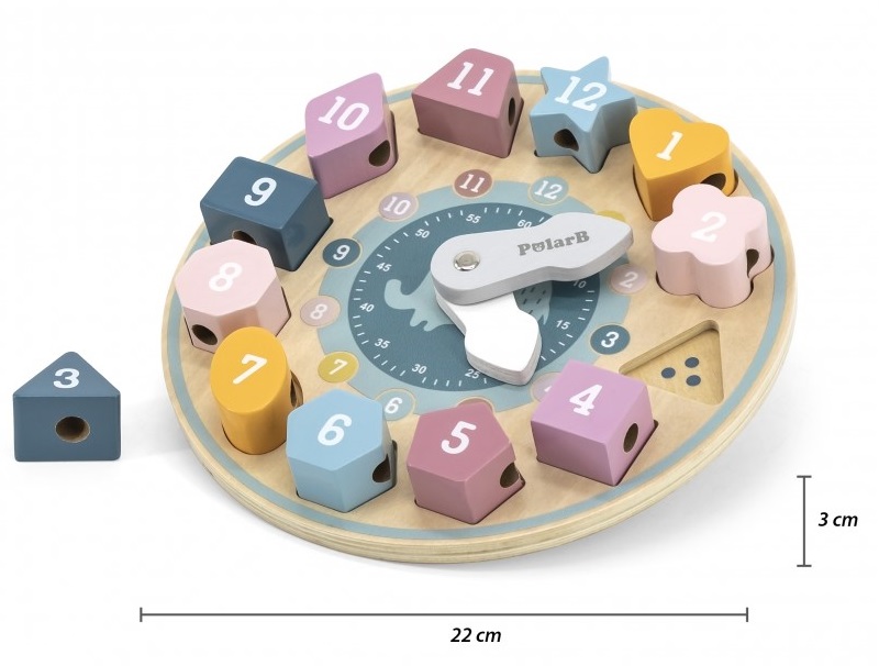 Образователен дървен часовник с числа в различни форми с пастелни цветове, които могат да се сортират или нанизват. Заниманията с този комплект ще помогне на децата да се запознаят с числата, формите, цветовете и да разпознават часовете. Формите са големи и удобни за хващане от малките ръчички и пасват на точно определено място върху часовника. Стрелките са лесно подвижни. В комплекта е включена и връвчица за нанизване. Нанизвайки всички части, децата тренират своята координация и фини двигателни умения.
