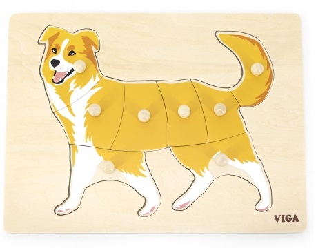 Пъзелът се състои си от дървена основа с издълбано легло и 8 елемента с дръжки за вгнездяване, изграждащи пъзел с изображение на куче. С този пъзел децата усъвършенстват зрително-двигателна координацията.