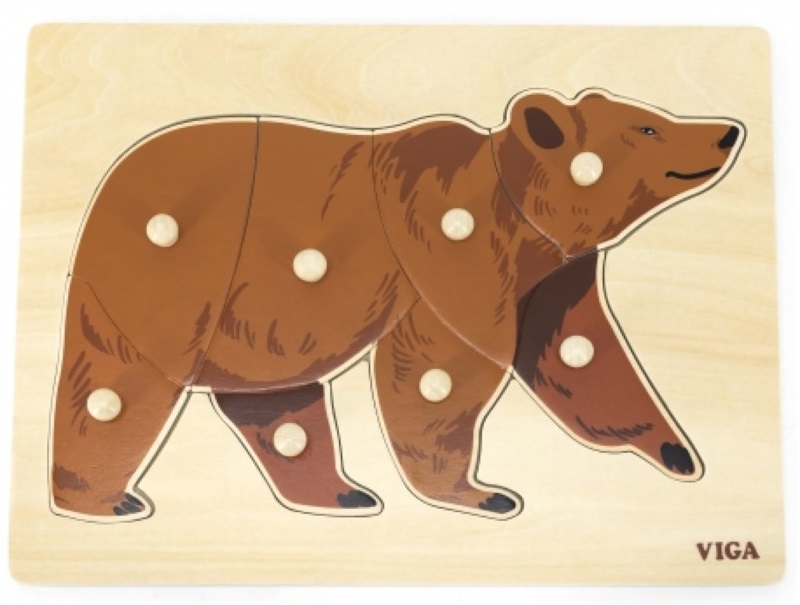 Пъзелът се състои си от дървена основа с издълбано легло и 8 елемента с дръжки за вгнездяване, изграждащи пъзел с изображение на мечка. С този пъзел децата усъвършенстват зрително-двигателна координацията.