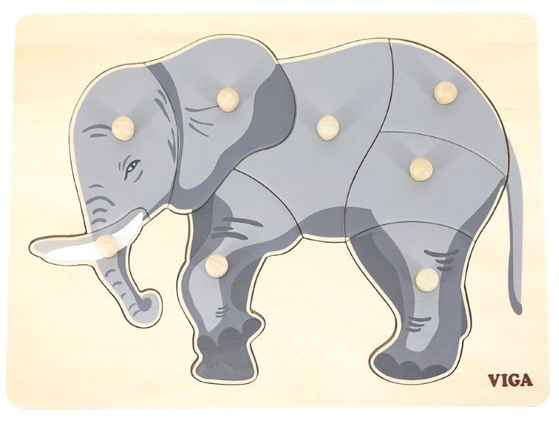 Пъзелът се състои си от дървена основа с издълбано легло и 8 елемента с дръжки за вгнездяване, изграждащи пъзел с изображение на слон. С този пъзел децата усъвършенстват зрително-двигателна координацията.