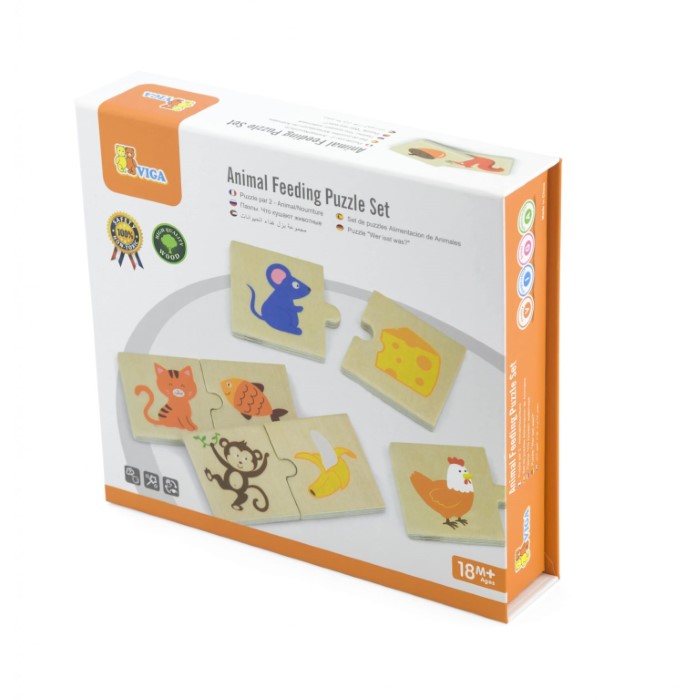Детски дървен пъзел – С какво се хранят животните от Viga toys, ще помогне на детето да се научи да реди пъзел, да опознае различните животни и какво обичат да похапват те.