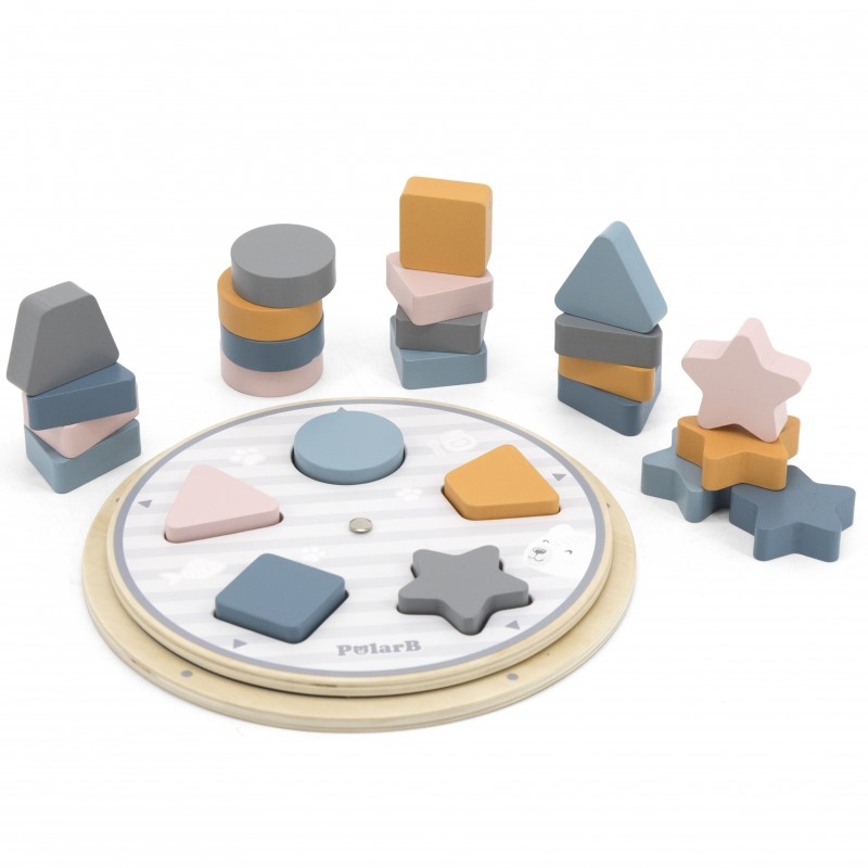Играчката учи, развива и забавлява едновременно. Блоковете са боядисани с нетоксични бои в меки цветове, които привличат вниманието на детето. Продуктът е изработен от висококачествени материали и с голямо внимание към детайлите. Задачата на детето е да съобрази цветовете и формата на блоковете с дупките в дъската. Чрез завъртане на горната част на дъската можем да сменим цвета на шарките на дъската.