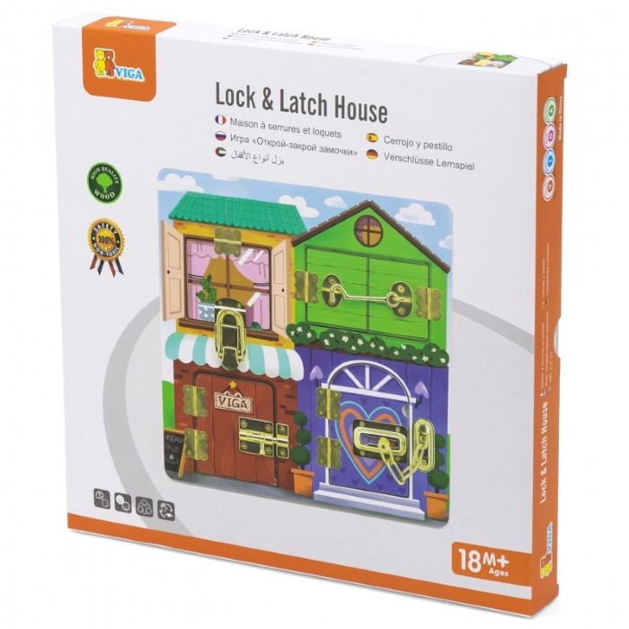 Дървената играчка е подходяща, както за дома, така и за детски градини, училища и образователни центрове. Тя е във формата на къща с две прозорчета и две врата. Дървените вратички и прозорчета са здраво закрепени с панти и имат 4 различни системи за отваряне и заключване. В под всяко прозорче и врата ще намерят различни маскирани животни.