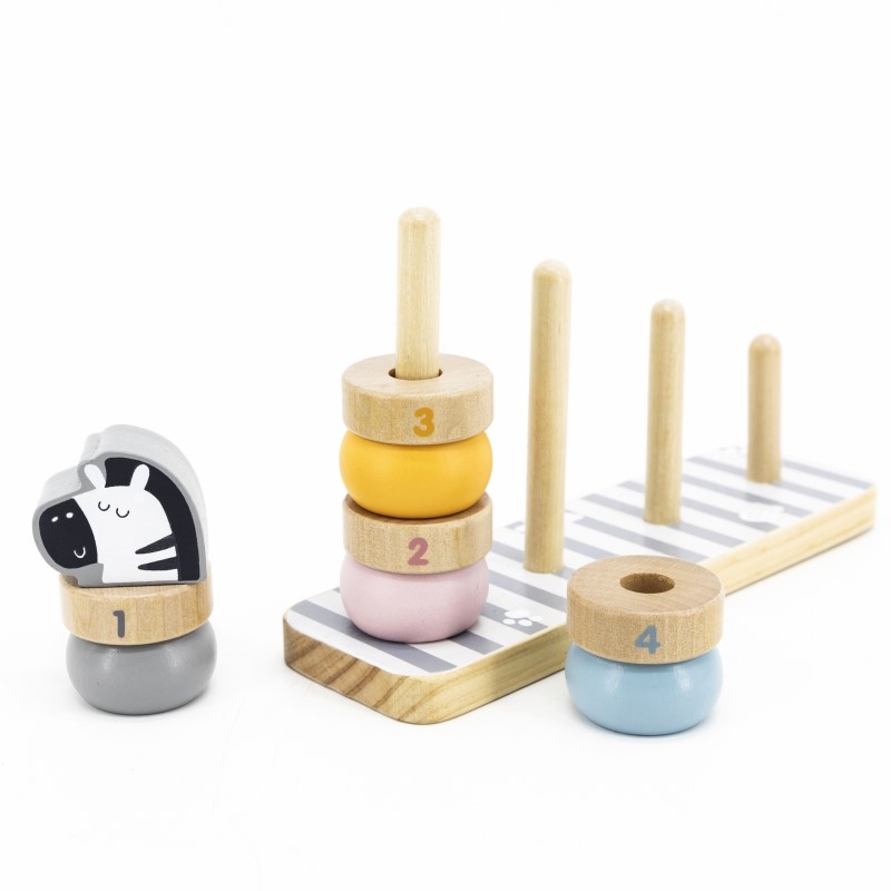 Играта се състой от стабилна дървена дъска в пастелни цветове с 4 пръчки и цветни рингове. Детето може да подрежда по цветове, да брои и поставя броя пръстени на съответното число и най-вече да се забавлява. Цветните форми са 10 на брой, в 4 цвята има 4 ринга с числата от 1 до 4 и 4 глави на сладки животни. Играта насърчава развитието на фини двигателни умения, както и запознаване с математиката и числата.