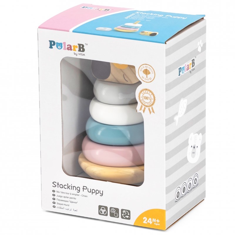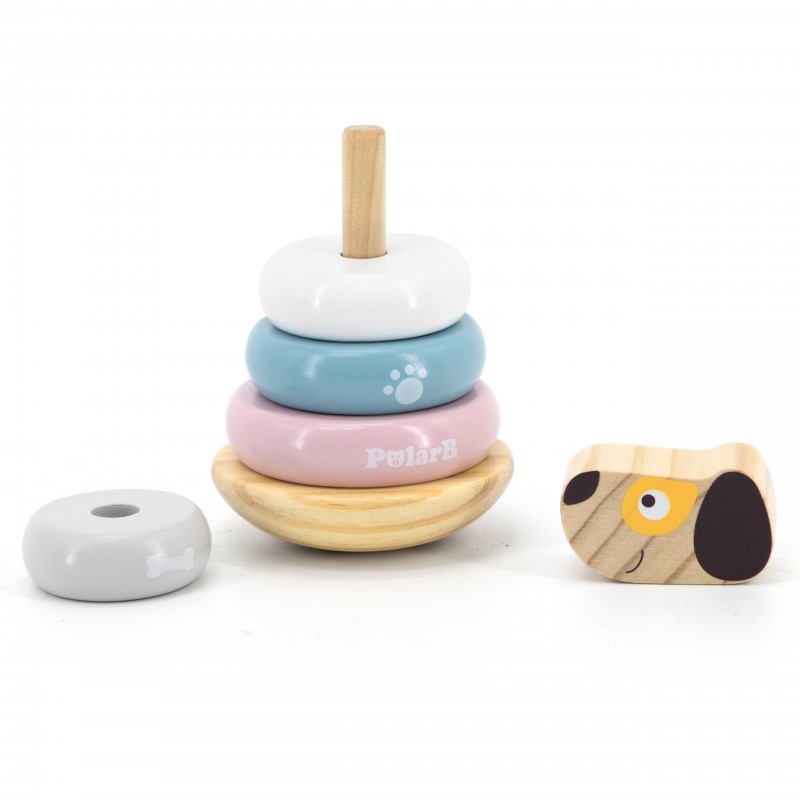 Дървената играчка с рингове за нанизване е подходяща за най-малките дечица. За тях ще е голямо предизвикателство да подредят тази кула от рингове, като се започне от най – големия ринг и се завърши отгоре със сладкото кученце. Тя е подходяща играчка за всички малчугани около първата им година. В комплекта има четири дървени ринга в меки пастелни цветове, оцветени с напълно безвредни бои и мастила.