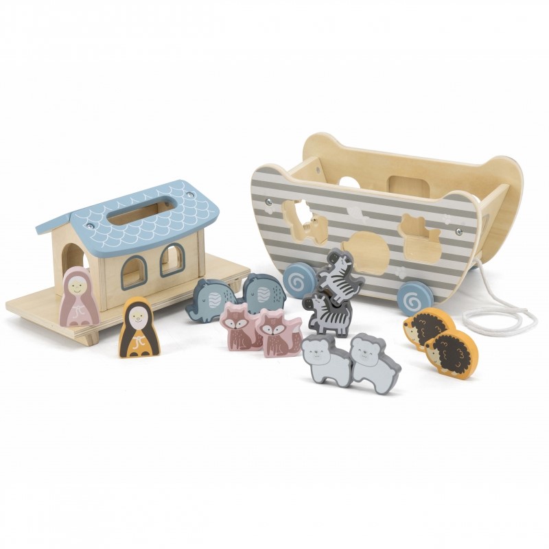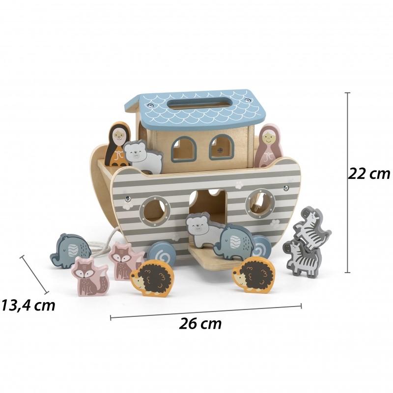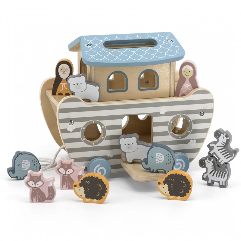 Детска дървена играчка за сортиране – Корабът на Ной e подходящ за игра от най – малките дечица. С нея децата могат да научат животните, да ги съберат по двойки, след което да намерят правилният отвор за тях и да ги спасят от потопа. Разкажете историята за Ноевия ковчег с една от най-древната дървени играчка датираща от древността. Образователна и занимателна дървена играчка състояща се от : фигурка на Ной, съпругата му, корабче на колела и десет животни : две зебри, две лисици, две слончета, две мечета и два таралежа. Кораба има въженце и благодарение на колелцата си може да пътешества от стая в стая.